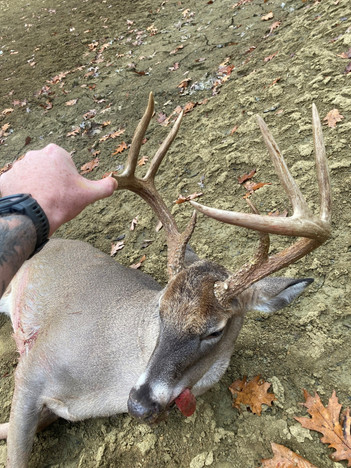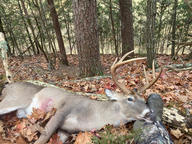 I begrudgingly and reluctantly went back and thought, “Ok I’m here, still nothing, Pop.” Once again, I could hear Pop telling me to take a breath and look. Shaking my head, I turned and faced the woods toward where the buck had run. I looked at the drainage ditch and looked off to the right of it, where I ran to. Nothing. Then, my eyes traced back to the left of the ditch where there was a log laying across the leaves and just inside the wood line. Laying on top of the log and staring directly at me, was that buck. He had been silent and still the whole time. I could not believe my eyes. I noticed the buck was still alive and now was unsuccessfully trying to get up and run.